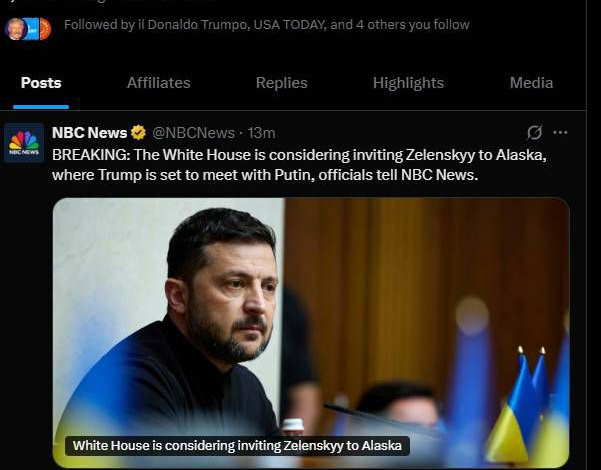 بر بنیاد گزارش ان‌بی‌سی نیوز، کاخ سفید در حال بررسی دعوت از ولودیمیر زلنسکی، رییس‌جمهور اوکراین، به آلاسکا است، جایی که قرار است دونالد ترامپ، رییس‌جمهور آمریکا، روز جمعه ۱۵ اگوست ۲۰۲۵ با ولادیمیر پوتین، رییس‌جمهور روسیه، دیدار کند.