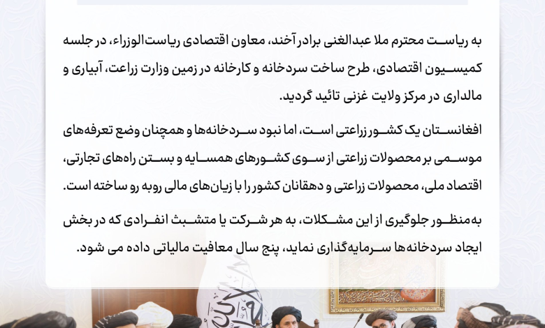 در نشست کمیسیون اقتصادی به ریاست ملا عبدالغنی برادر، معاون اقتصادی ریاست‌الوزرا، تصمیم گرفته شد که سرمایه‌گذاران در بخش اعمار سردخانه‌ها از مالیات پنج‌ساله معاف شوند.