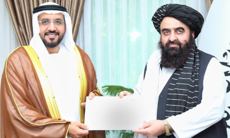 سیف محمد الکتبی، سفیر جدید امارات متحده عربی در کابل نسخه‌ اعتبارنامه خود را به مولوی امیرخان متقی، وزیر امور خارجه ارائه کرد.