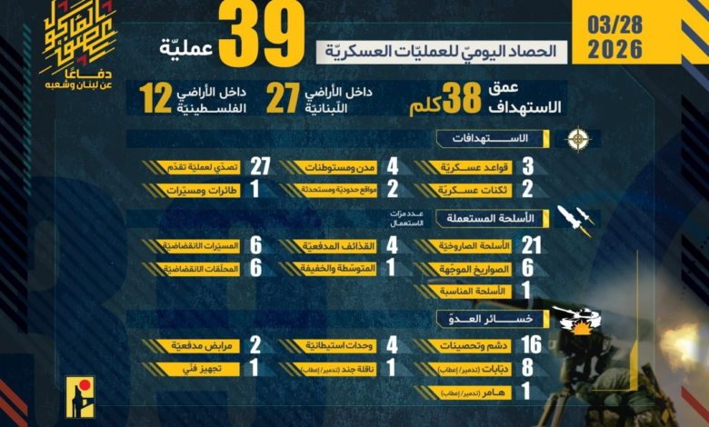 مقاومت اسلامی لبنان اعلام کرد که در ۲۴ ساعت گذشته در مجموع ۳۹ عملیات علیه مواضع اشغالگران صهیونیستی در مناطق مرزی ودر عمق فلسطین اشغالی انجام داده است.