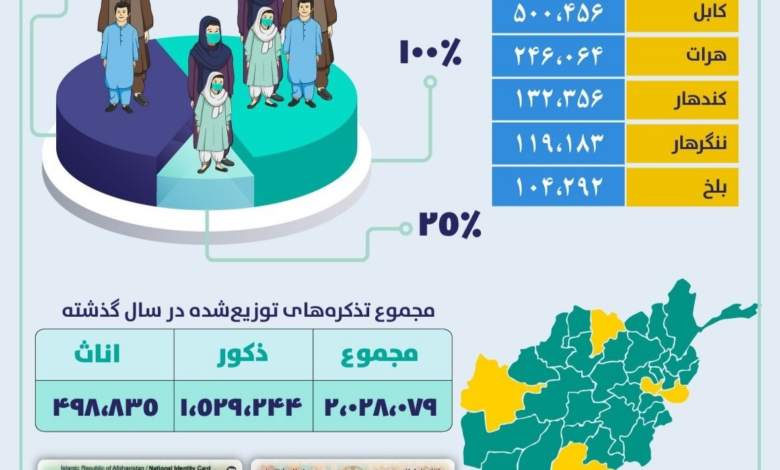 بیشترین تذکرههای الکترونیکی توزیعشده، در ولایت کابل بوده که برای ۵۰۰ هزار و ۴۵۶ تن از هموطنان توزیع شده است.