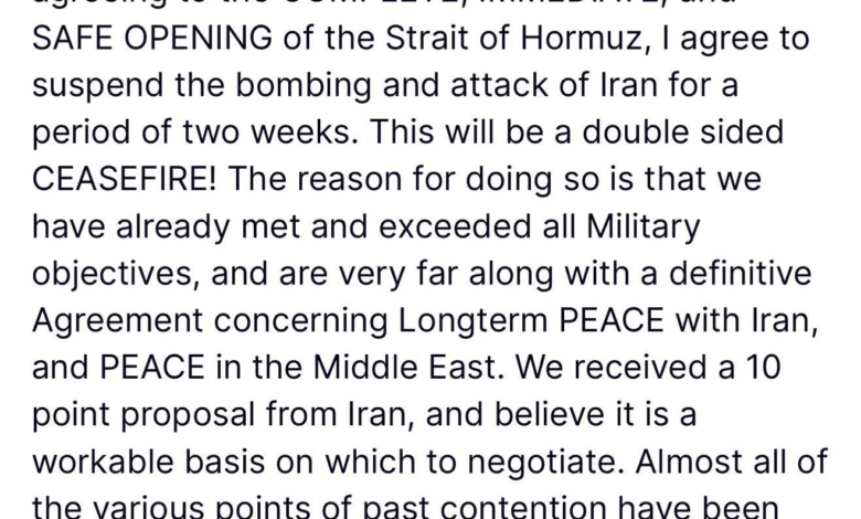 ترامپ گفت: مشروط به موافقت جمهوری اسلامی ایران با بازگشایی کامل، فوری و ایمن تنگه هرمز، با تعلیق بمباران و حمله به ایران به مدت دو هفته موافقت میکنم.